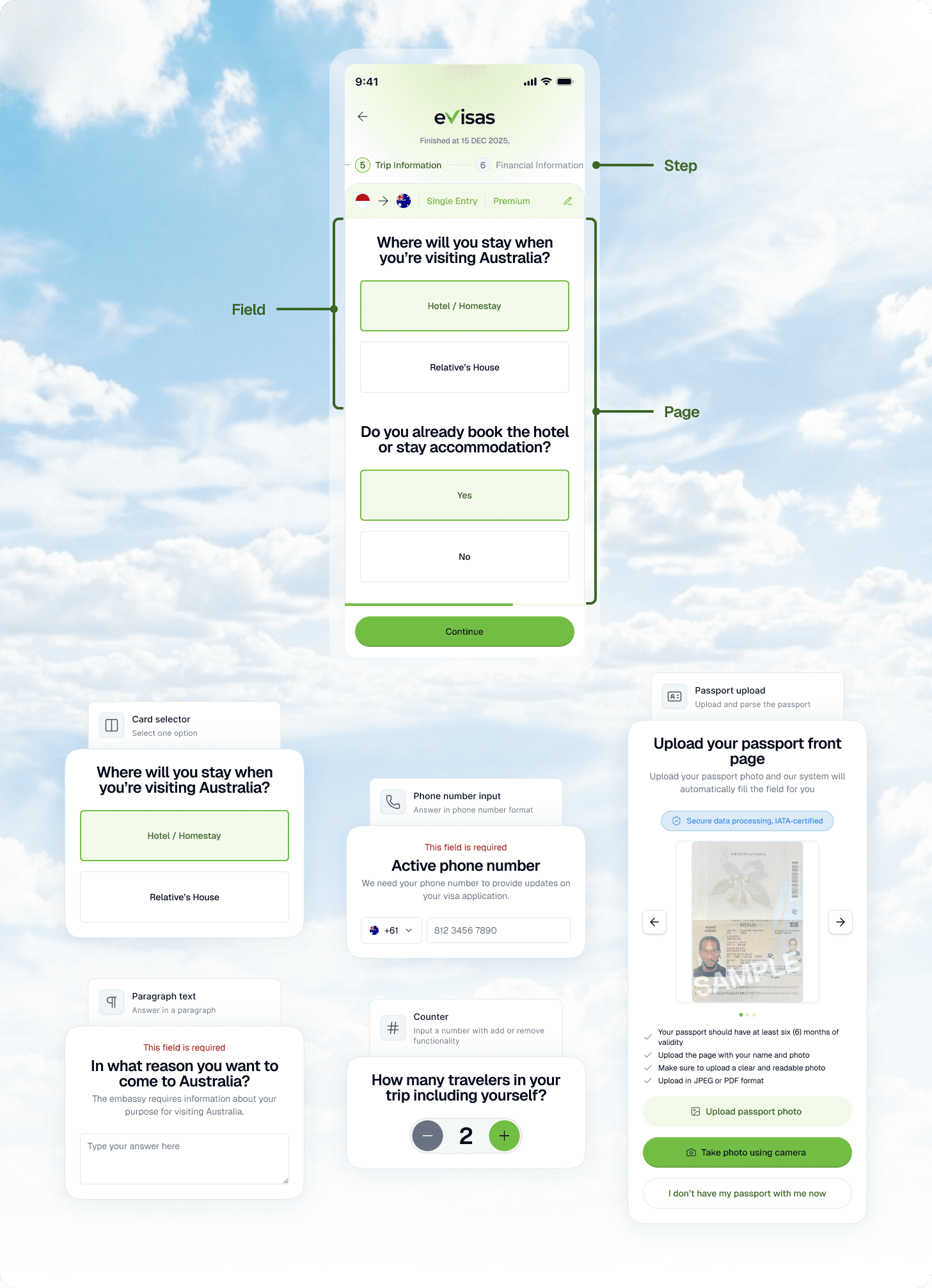 I also re-engineered the form’s Information Architecture from a flat structure into a 3-Layer Hierarchy: Steps | Pages | Fields. This shift was a strategic move toward Progressive Disclosure, ensuring that users are only presented with one thematic context at a time. By chunking exhaustive visa requirements into logical steps and pages, I eliminated the "Wall of Forms" effect that leads to high cognitive fatigue. This architecture prevents "Context-Jumping," allowing the user to remain in a focused flow state by completing one specific category of information (e.g., Personal Details or Travel History) before moving to the next.