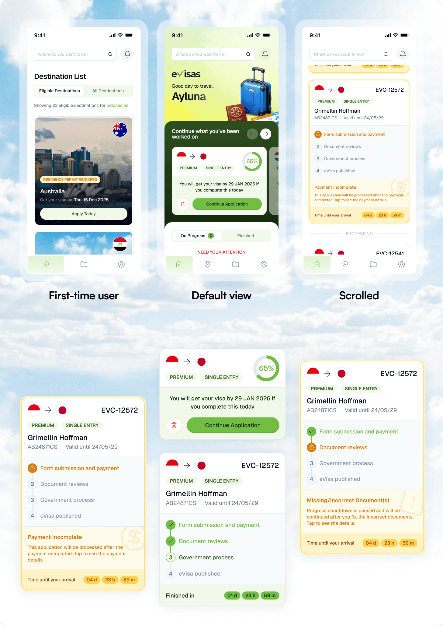 Intent-Based Hierarchy by Collapsing Draft States: Feedback indicated that "Unfinished Applications" were consuming too much prime visual real estate. I restructured this section into a collapsed, secondary view. By minimizing the footprint of incomplete drafts, I cleared the path for the user’s primary goal—monitoring active visas—while ensuring the "resume" path remained prominent enough to be accessible.