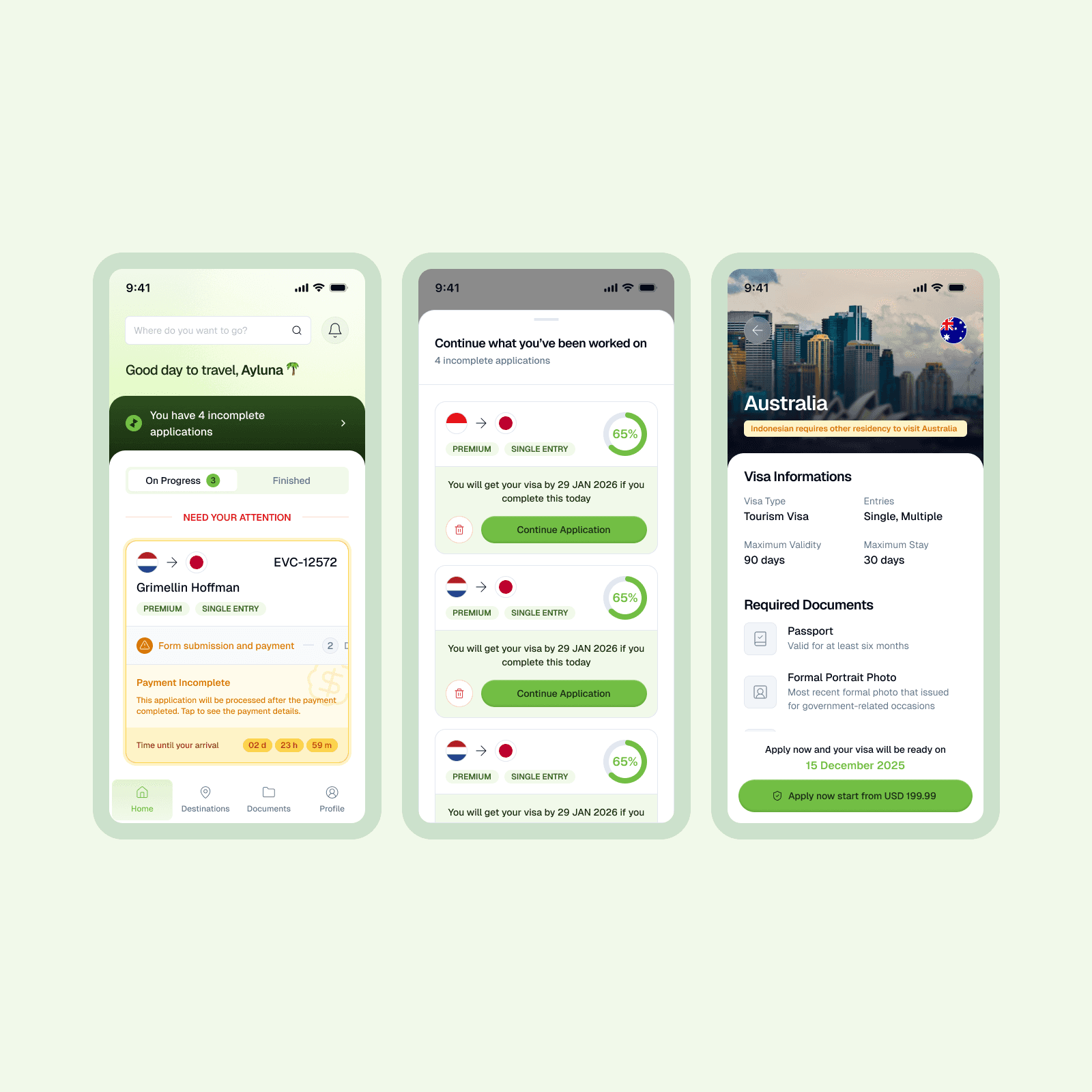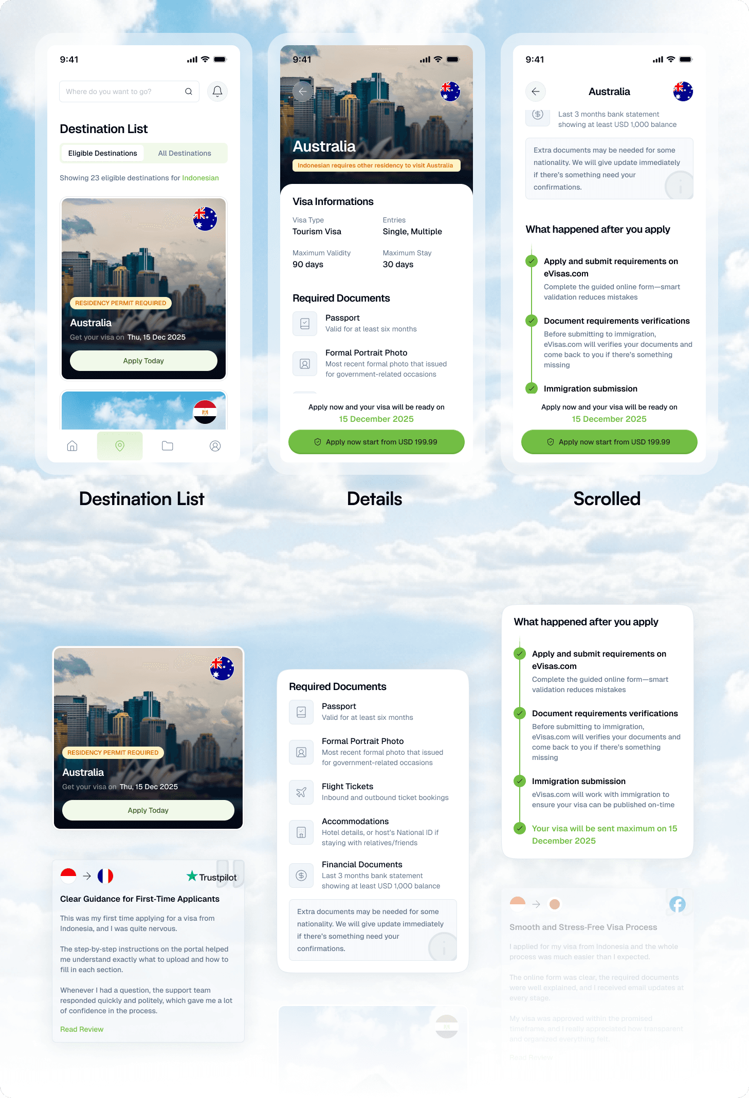 For the Destination Details, the strategy shifted toward Information Synthesis and Temporal Assurance. I modularized high-stakes data—including eligibility criteria, entry limits, and required documentation—into a scannable "Single Source of Truth" to reduce cognitive load. To provide immediate psychological safety, I implemented a Dynamic Completion Estimate, showing the exact date a visa would be finalized if started today. This transparency replaces regulatory anxiety with a predictable, professional timeline that reinforces the value of our service and drives immediate conversion.